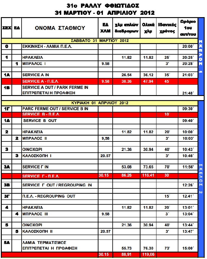 Την Κυριακή 01/04/2012 τώρα, το μέν Ραλλύ συνεχίζεται με 2χ2 ε.δ. (Μπράλος – Καλοσκοπή) των 9,58 και 20.57 χλμ. αντίστοιχα, το δε Σπρίντ με 1χ2 ε.δ. (Μπράλος) των 9.58 χλμ., με έξοδο 1ου αυτοκινήτου από το park ferme της Π.Ε.Λ. στις 09:30΄ακριβώς, ενώ η τελετή Τερματισμού θα γίνει στην κεντρική Πλατεία Ελευθερίας της Λαμίας την ίδια ημέρα στις 15:00΄, με την τελετή Απονομής να ακολουθεί στις 17:30΄στην αίθουσα του Δημοτικού Συμβουλίου του Δήμου Λαμιέων (Αινιάνων 6) στην Λαμία.