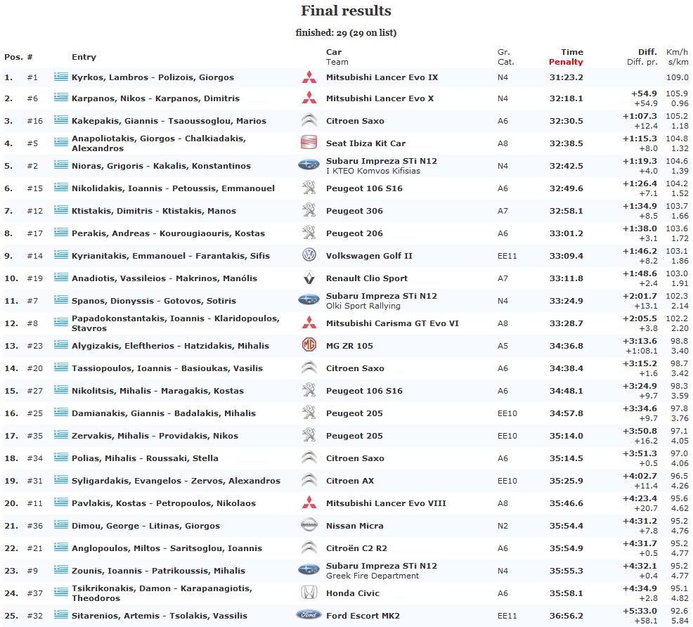 Nικητές στο ράλλυ Κρήτης ο Λάμπρος Κύρκος και ο Γιώργος Πολυζώης με Mitsubishi Lancer EVO 9,κερδίσανε και της έξι ειδικές του αγώνα και με αυτή την νίκη τους εξασφάλισαν τον τίτλο στο πανελλήνιο πρωτάθλημα ράλλυ.