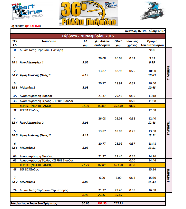 Η φετινή εκδοχή, περιλαμβάνει συνολικά 7 ειδικές διαδρομές (Άνω Αλεποχώρι, Άγιος Ιωάννης, Μελετάκι), με τις πρώτες δύο να έχουν προγραμματιστεί για δύο και την τελευταία για τρία αγωνιστικά περάσματα. Πιο αναλυτικά, η εκκίνηση του 1ου αγωνιστικού αυτοκινήτου θα δοθεί από το Λιμάνι της Νέας Περάμου, το Σάββατο 28 Νοεμβρίου στις 09.00. Μετά την εκκίνηση, τα πληρώματα θα κατευθυνθούν προς την παραλία Αλεποχωρίου μέσω Μεγάρων, για μια νέα Ειδική Διαδρομή, που ονομάζεται «Άνω Αλεποχώρι», έχει μήκος 5.06 χιλιομέτρων και είχε χρησιμοποιηθεί πολύ παλιά στο Ράλλυ Ακρόπολις με κατηφορική κατεύθυνση, σε αντίθεση με φέτος. Η συνέχεια περιλαμβάνει την Ειδική Διαδρομή «Άγιος Ιωάννης», που έχει μήκος 8.15 χιλιομέτρων και είναι ίδια με πέρυσι, ενώ το loop θα ολοκληρωθεί με μια πολύ γνωστή Ειδική Διαδρομή, το «Μελετάκι», που έχει μήκος 8.08 χιλιομέτρων, όμως δε θα διεξαχθεί όπως συνήθως με κατεύθυνση από Μάνδρα προς Κανδήλι, αλλά με αντίθετη φορά. Έπειτα, τα πληρώματα θα επιστρέψουν στο επίκεντρο του αγώνα, τη Νέα Πέραμο, για επισκευές και ανασυγκρότηση, προτού επαναλάβουν τις ίδιες Ειδικές Διαδρομές. Μετά από ακόμη μια "επίσκεψη" στο Service Park της Νέας Περάμου, το τρίτο πέρασμα από την Ειδική Διαδρομή «Μελετάκι» θα ολοκληρώσει τα 50.66 αγωνιστικά χιλιόμετρα του ράλλυ, προτού το 1ο αυτοκίνητο τερματίσει στη Νέα Πέραμο.