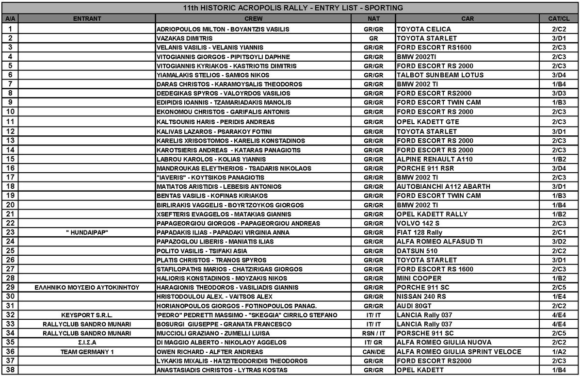 Στην κατηγορία Sporting θα συμμετέχουν 38 πληρώματα. Πέντε διεθνή πληρώματα θα λάβουν μέρος, προσφέροντας τη δική τους ξεχωριστή πινελιά στο 11ο Ιστορικό Ράλλυ Ακρόπολις, το οποίο αποτελεί τον τελευταίο γύρο του Πανευρωπαϊκού Πρωταθλήματος Ιστορικών Αυτοκινήτων, αλλά και τον προτελευταίο του εγχώριου θεσμού.