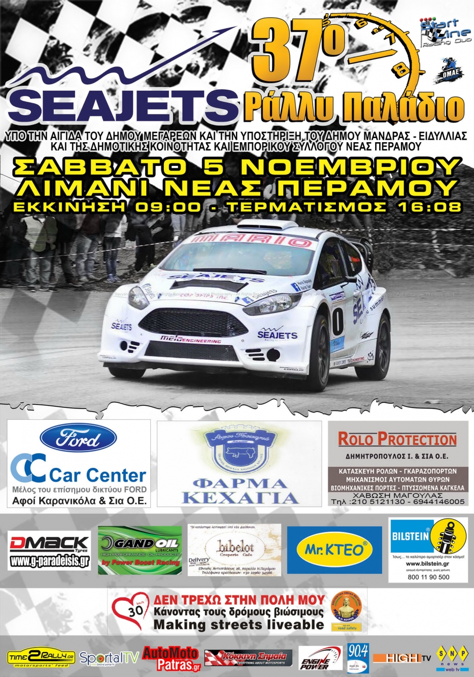 Παράθεση: Με 45 συμμετοχές το Seajets 37ο Ράλλυ ΠαλάδιοΟι προετοιμασίες για τον αγώνα έχουν μπει στην τελική ευθεία, με 45 πληρώματα να ετοιμάζονται για το αγωνιστικό ραντεβού του Σαββάτου 5 Νοεμβρίου στη Νέα Πέραμο Μεγάρων. Λίγες ημέρες απομένουν για την διεξαγωγή του Seajets 37ου Ράλλυ Παλάδιο, που θα έχει ως επίκεντρο την Νέα Πέραμο Μεγάρων και διοργανώνεται από το Αθλητικό Σωματείο "Start Line". Ο αγώνας έχει ως Χορηγό Ονομασίας την εταιρεία Seajets, που βρίσκεται πάντα δίπλα στον Ελληνικό Μηχανοκίνητο Αθλητισμό, είναι μονοήμερος και περιλαμβάνει 7 Ειδικές Διαδρομές, μήκους 50,36 χιλιομέτρων. Το Seajets 37ο Ράλλυ Παλάδιο προσμετρά σε δύο σημαντικούς θεσμούς των ελληνικών αγώνων, αφού αποτελεί τον 5ο και τελευταίο γύρο του Περιφερειακού Κυπέλλου Ασφάλτινων Ράλλυ Κεντρικής Ελλάδος, ενώ θα είναι ταυτόχρονα η τελευταία φετινή συνάντηση, για το Πανελλήνιο Πρωτάθλημα Ράλλυ Ιστορικών Αυτοκινήτων. Οι συμμετοχές έφτασαν τις 45 και διακρίνονται για την ποιότητά τους, καθώς οι μάχες για τη νίκη, τόσο σε επίπεδο Γενικής Κατάταξης, όσο και στις επιμέρους Κατηγορίες, αναμένονται συναρπαστικές. Η ποιότητα των πληρωμάτων, εγγυάται και το θέαμα για τους θεατές που θα βρεθούν στις Ειδικές Διαδρομές του αγώνα, που είναι οι διαδρομές Άνω Αλεποχώρι (5,06 χιλιόμετρα), Νέος Άγιος Ιωάννης (8,15 χιλιόμετρα) και Μελετάκι (7,98 χιλιόμετρα), με τις δύο πρώτες να διεξάγονται από δύο φορές και την τρίτη, να έχει προγραμματιστεί για 3 περάσματα. Το Αθλητικό Σωματείο "Start Line", θέλοντας να αναδείξει το κοινωνικό πρόσωπο των αγώνων, καθώς ο Μηχανοκίνητος Αθλητισμός οφείλει να είναι ενεργός μέσα στο κοινωνικό γίγνεσθαι, θα φιλοξενήσει κατά τη διάρκεια του αγώνα, δράση για την Οδική Ασφάλεια. Πιο συγκεκριμένα, η Εθελοντική Ομάδα Μεγάρων "Α.Ο. Κούρος", με επικεφαλής τον κύριο Σωτήρη Γιαννόπουλο, θα βρίσκεται στον χώρο του σέρβις παρκ στη Νέα Πέραμο, διανέμοντας ενημερωτικό υλικό στους θεατές, τα μέλη των ομάδων και τα πληρώματα σχετικά με την Οδική Ασφάλεια και την Κυκλοφοριακή Αγωγή. Το κεντρικό μήνυμα της ενημέρωσης θα είναι "Δεν τρέχω στην Πόλη μου" και αφορά στην αναγκαιότητα μείωσης των ορίων ταχύτητας εντός κατοικημένων περιοχών, από 50 σε 30 χιλιόμετρα/ώρα. Η Οργάνωση ενός ακόμη Ράλλυ Παλάδιο, δε θα μπορούσε να προχωρήσει δίχως την θερμή υποστήριξη της Τοπικής Αυτοδιοίκησης, κάτι που συμβαίνει φέτος για ακόμη μια φορά. Το Seajets 37ο Ράλλυ Παλάδιο, τελεί υπό την Αιγίδα του Δήμου Μεγαρέων, έχοντας ταυτόχρονα την υποστήριξη του Δήμου Μάνδρας-Ειδυλλίας, της Δημοτικής Κοινότητας και του Εμπορικού Συλλόγου Νέας Περάμου. Συνημμένο: