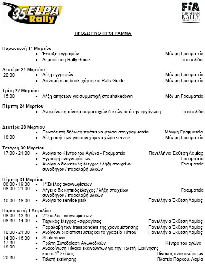 Αλλάζει τερέν το Ράλλυ ΕΛΠΑ για φέτος και θα διεξαχθεί σε ασφάλτινες διαδρομές της φινΛαμίας.Η ΕΛΠΑ διοργανώνει 1 με 3 Απριλίου 2011 το 35ο ΕΛΠΑ Ράλλυ, το οποίο αποτελεί και τον πρώτο αγώνα του ERC, με βάση του το Εκθεσιακό Κέντρο της Λαμίας που στο παρελθόν είχε φιλοξενήσει το Ράλλυ Ακρόπολις. Στους χώρους του Εκθεσιακού Κέντρου θα λειτουργήσει η γραμματεία του αγώνα, το γραφείο τύπου αλλά και το service park. Ο αγώνας που είναι διήμερος, περιλαμβάνει 6 ειδικές διαδρομές συνολικού μήκους 163 χλμ την πρώτη μέρα και 6 ειδικές διαδρομές μήκους 92 χλμ τη δεύτερη μέρα.Με την αλλαγή της ημερομηνίας αλλά και των διαδρομών από χώμα σε άσφαλτο, ελπίζω να συγκεντρωθούν αρκετές συμμετοχές και από το Ευρωπαϊκό Πρωτάθλημα. Μέχρι στιγμής έχει ανακοινωθεί ένα προσωρινό πρόγραμμα του αγώνα. Συνημμένο: