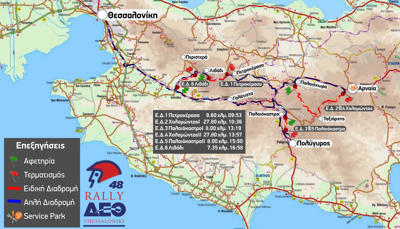 Επίκεντρο του ράλλυ είναι ως είθισται η Θεσσαλονίκη και πιο συγκεκριμένα ο χώρος που φιλοξενείται παραδοσιακά η Διεθνής Έκθεση Θεσσαλονίκης (Δ.Ε.Θ.), με τη Νότια Πύλη να στεγάζει την Εκκίνηση, τον Τερματισμό και τον Τεχνικό Έλεγχο. Η δραστηριότητα θα ξεκινήσει το απόγευμα του Σαββάτου 12 Σεπτεμβρίου, όταν και θα πραγματοποιηθεί ο Τεχνικός Έλεγχος των αυτοκινήτων, ενώ το ίδιο βράδυ θα διεξαχθεί η φαντασμαγορική τελετή εκκίνησης, που αναμένεται να συγκεντρώσει πολλούς θεατές. Το καθαρά αγωνιστικό μενού θα ξεκινήσει το πρωί της Κυριακής 13 Σεπτεμβρίου, με τα πληρώματα να ξεκινούν από τη Νότια Πύλη της Δ.Ε.Θ. στις 09.00, για να τερματίσουν εκεί στις 17.58, αφού πρώτα θα έχουν αγωνιστεί σε 6 Ειδικές Διαδρομές μήκους 88,55 χιλιομέτρων. Σημειώνουμε πως ανάμεσα στις 4 Ειδικές Διαδρομές που θα διεξαχθούν (Πετροκέρασα, Χολομώντας, Παλαιόκαστρο, Λιβάδι), ο φημισμένος Χολομώντας και το Παλαιόκαστρο θα διεξαχθούν δύο φορές, ενώ τα Πετροκέρασα και το Λιβάδι από μία φορά.
