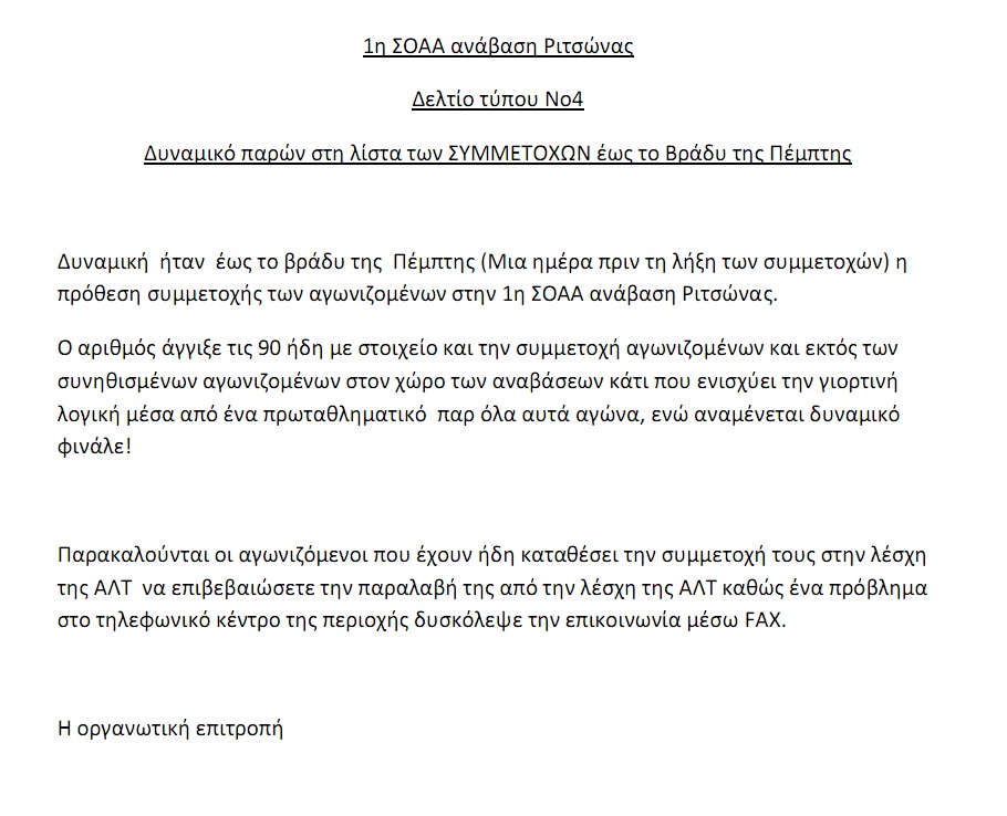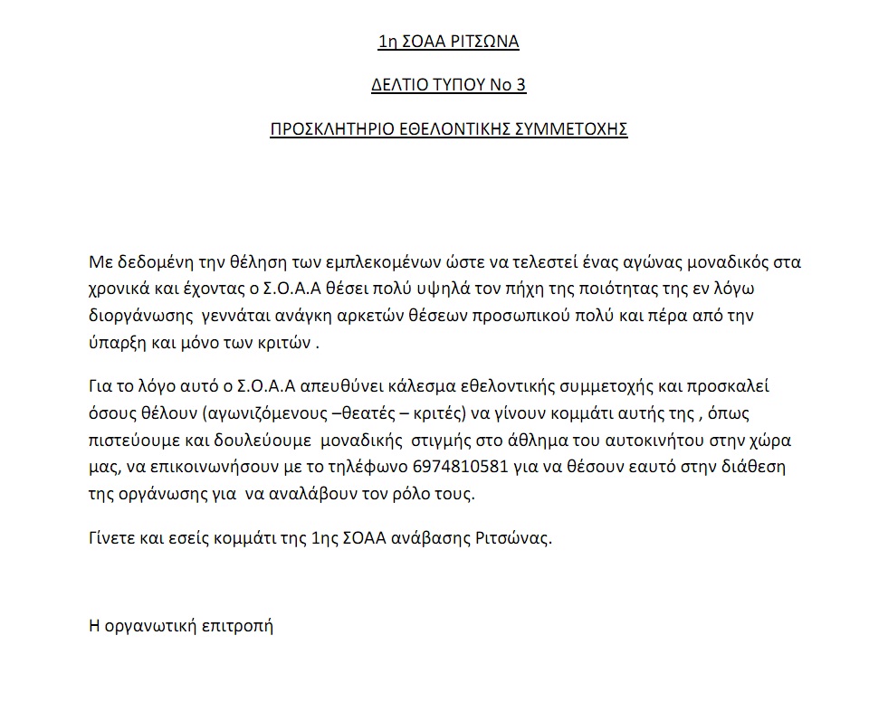 soaa.eu έγραψε: 1Η ΣΟΑΑ ΑΝΑΒΑΣΗ ΡΙΤΣΩΝΑΣ ΔΕΛΤΙΟ ΤΥΠΟΥ Νο 2 Με συνέντευξη τύπου που έγινε την Τρίτη 24 Ιουνίου στο Athens Park Hotel, μέλη του Δ.Σ. του ΣΟΑΑ, ενημέρωσαν τους παρευρεθέντες δημοσιογράφους ότι, προχωρούν οι ετοιμασίες για την 1η ΣΟΑΑ Ανάβαση Ριτσώνας, που θα διοργανωθεί στην ιστορική διαδρομή στις 5 Ιουνίου με ευθύνη του Συνδέσμου Οδηγών Αγώνων Αυτοκινήτου (ΣΟΑΑ) και διοργανώτρια λέσχη την Αγωνιστική Λέσχη Τρίπολης (ΑΛΤ). Οι πολλές καινοτομίες που θα εφαρμοστούν σε αυτή την -θέλουμε να πιστεύουμε- υποδειγματική ανάβαση, πηγάζουν από χρόνια αιτήματα και μόνιμες παρατηρήσεις των οδηγών σε προηγούμενους αγώνες. Ο χώρος των πιτς θα είναι μέσα στον χώρο της Ελληνικής Σωληνουργίας, που ευχαρίστως φιλοξενεί αυτή την προσπάθεια του ΣΟΑΑ, ενώ ο τεχνικός έλεγχος θα γίνει στον ίδιο χώρο. Πολλαπλά τα οφέλη αυτής της μετακίνησης των πιτς, καθώς οι αγωνιζόμενοι εξασφαλίζουν άπλετο και ασφαλή χώρο για τις ομάδες τους, ενώ οι θεατές χώρους παρκαρίσματος, εκεί όπου στις προηγούμενες διοργανώσεις εγκαθίσταντο τα αυτοκίνητα των σέρβις και τα τρέϊλερς. Στον χώρο των πιτς θα λειτουργεί αυτόνομη μεγαφωνική εγκατάσταση προκειμένου οι αγωνιζόμενοι να ακούν ευκρινώς τις οδηγίες του αλυτάρχη, ενώ άλλη μεγαφωνική (ασύρματη) θα εγκατασταθεί σε όλα τα «Κ», με στόχο τη συνεχή πληροφόρηση των θεατών για την εξέλιξη του αγώνα. Παράλληλα η μετάδοση του αγώνα θα καλύπτεται και από τοπικό ραδιόφωνο. Οι θεατές καλό είναι να γνωρίζουν ότι, από τις 08:30 το πρωί της Κυριακής ο δρόμος θα κλείσει για όλους εκτός από τα αυτοκίνητα των οργανωτών και δυο πούλμαν που θα μεταφέρουν κόσμο από την αφετηρία προς τον τερματισμό και το ανάποδο, αποβιβάζοντας τους σε σημεία όπου είναι εξασφαλισμένη η ασφαλής παρακολούθηση του αγώνα.Επιπλέον όσοι ενδεχομένως πρόλαβαν να εισέλθουν με αυτοκίνητο εντός της αγωνιστικής διαδρομής, καλό είναι να γνωρίζουν πως ανάμεσα στα δυο σκέλη ο δρόμος δε θα ανοίξει και συνεπώς η όποια μετακίνηση μπορεί να γίνει μόνο με τα δυο πούλμαν και σε όσο χρόνο υπάρχει διαθέσιμος για αυτά.Στην αφετηρία της διαδρομής και συγκεκριμένα εκεί όπου αρχίζει να μετρά ο χρόνος, θα τοποθετηθεί τέντα μήκους σχεδόν 10 μέτρων, δίνοντας ιδιαίτερο χρώμα στην εικόνα και προστασία από τον ήλιο (ελπίζουμε όχι βροχή…) σε οδηγό και αρμόδιους κριτές.Τέλος το Σάββατο και αμέσως μετά το τέλος των χρονομετρημένων δοκιμαστικών, θα γίνει στο χώρο των πιτς μια γιορτή με μουσική και μπουφέ, τόσο για τους συμμετέχοντες όσο και για τους παρευρισκόμενους, προκειμένου να τονιστεί το εορταστικό χρώμα της διοργάνωσης.Όσον αφορά την ασφάλεια τονίστηκε για μια ακόμα φορά πως δε θα γίνει καμιά έκπτωση, ο Δήμος Χαλκιδέων (υπό την αιγίδα του οποίου διοργανώνεται η ανάβαση) θα παρέχει κάθε βοήθεια, παρά τις πρόσφατες μεταβολές του σχεδίου Καλλικράτη. Τονίστηκε επίσης πως, ο Σύνδεσμος δε φιλοδοξεί να διεκδικήσει τίτλους οργανωτή, παρά μόνο να συλλέξει εμπειρίες ελπίζοντας ταυτόχρονα να δώσει ένα μέτρο σύγκρισης για τις επόμενες διοργανώσεις,αλλά και να αντιληφθεί την βιωσιμότητα των οποιωνδήποτε .τυχόν διεκδικήσεων του στο μέλλον, εκτός βέβαια από τα μέτρα ασφαλείας στα οποία δεν δέχεται καμμία παραχώρηση. Όσον αφορά το αγωνιστικό σκέλος, οι δηλώσεις συμμετοχών μπορούν να υποβληθούν μέχρι την Παρασκευή 27/5/11 στην ΑΛΤ (βιομηχανική περιοχή Τρίπολης) Γιαννόπουλος Νικόλαος τηλ. & φαξ 2713-005527, ή στο 6977011