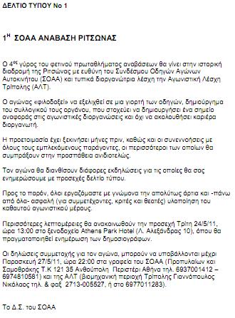 Παράθεση: 1η Σ.Ο.Α.Α. Ανάβαση Ριτσώνας: Συνέντευξη Τύπου Πολλές αλλαγές σε σχέση με το πρόσφατο παρελθόν θα έχει η φετινή Ανάβαση Ριτσώνας, η 1ηΣ.Ο.Α.Α. Ανάβαση Ριτσώνας που θα αποτελέσει την πρώτη εμπλοκή του Συνδέσμου Οδηγού Αγώνων Αυτοκινήτου στα οργανωτικά ενός αγώνα. Σε συνέντευξη Τύπου που παραχωρήθηκε σε κεντρικό ξενοδοχείο, κίνηση που δείχνει επίσης τη σοβαρότητα της προσέγγισης του αγώνα και σε επίπεδο προβολής των προσπαθειών, ο πρόεδρος του Συνδέσμου, Γιώργος Κοσμόπουλος εξήγησε τόσο το υπόβαθρο της απόφασης να ασχοληθεί οργανωτικά ο Σ.Ο.Α.Α., από κοινού με την Αγωνιστική Λέσχη της Τρίπολης, όσο και τις λεπτομέρειες οι οποίες θα κάνουν τη διαφορά σε σχέση με τις υπόλοιπες εγχώριες διοργανώσεις. Η 1η Σ.Ο.Α.Α. Ανάβαση Ριτσώνας θα είναι ο τέταρτος αγώνας του φετινού Πανελληνίου Πρωταθλήματος Αναβάσεων και αποτελεί σταθμό στη φετινή χρονιά τόσο σε ό,τι έχει να κάνει με τις συμμετοχές που θα προσελκύσει, όσο και σε ό,τι έχει να κάνει με το ενδιαφέρον που θα δείξουν οι θεατές σε μια δύσκολη εποχή. Πρώτο νέο χαρακτηριστικό είναι ο χώρος των πιτς που φέτος δεν θα είναι στη διαδρομή μέχρι την αφετηρία του αγώνα, αλλά στις εγκαταστάσεις της Σωληνουργίας Ελλάδας (αυτής που οι περισσότεροι γνωρίζουμε ως Μηχανική). Σε κλειστό χώρο λοιπόν, μέσα σε ένα τολ που έχει παραχωρήσει η εταιρεία στους οργανωτές θα γίνει ο τεχνικός έλεγχος καθώς και θα στεγαστούν υπηρεσίες του αγώνα, ενώ στον περιβάλλοντα χώρο τα αγωνιστικά αυτοκίνητα, οι μηχανικοί, οι οδηγοί και οι επισκέπτες θα έχουν σαφώς περισσότερο χώρο να κινηθούν με άνεση και να δημιουργήσουν μια όμορφη και τακτοποιημένη εικόνα service την οποία θα μπορούν να επισκέπτονται και οι θεατές.