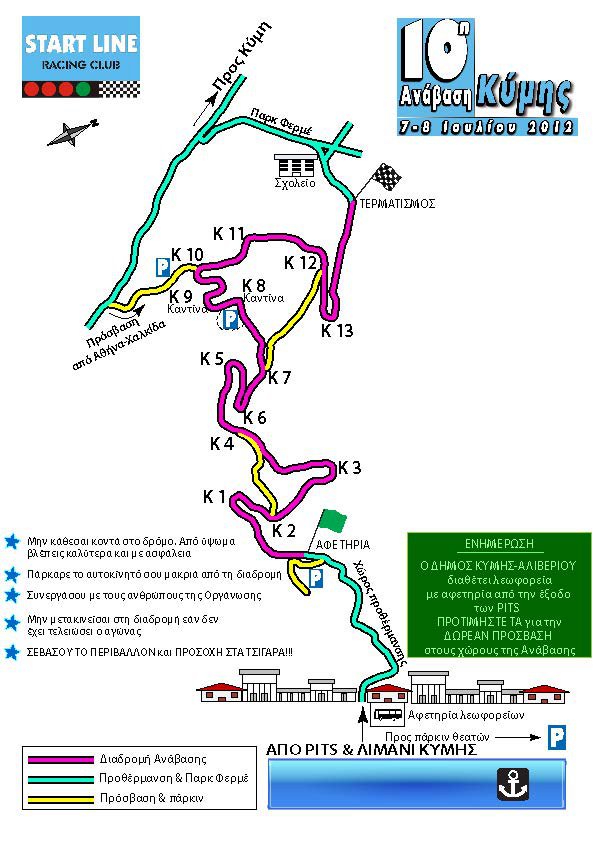 Στις 7 & 8 Ιουλίου, μέσα στην καρδιά του καλοκαιριού και σε μία από τις πιο όμορφες περιοχές της Ελλάδας, διοργανώνεται η 10 Ανάβαση Κύμης με τη συνεργασία της START LINE, του Δήμου Κύμης – Αλιβερίου και την υποστήριξη της Λέσχης Αυτοκινήτου Κύμης «ΕΛΜΑ». Με τη νέα ημερομηνία τέλεσης, συμμετέχοντες και θεατές θα έχουν την ευκαιρία να απολαύσουν εκτός από έναν πάντα θεαματικό αγώνα στις 52 στροφές της πιο τεχνικής ανάβασης του Πανελλήνιου Πρωταθλήματος, τη γνωστή φιλοξενία των κατοίκων της πόλης, αλλά και τις όμορφες παραλίες της περιοχής. Το βράδυ του Σαββάτου 7 Ιουλίου ο Δήμος Κύμης – Αλιβερίου έχει προγραμματίσει συναυλία έντεχνου λαϊκού τραγουδιού στο γήπεδο της πόλης, ενώ για ακόμα μία φορά οι συμμετέχοντες οδηγοί θα φιλοξενηθούν σε ξενοδοχεία της περιοχής από την τοπική αυτοδιοίκηση. Το πρόγραμμα του αγώνα έχει ως εξής: - Λήξη συμμετοχών: Παρασκευή 29/6, ώρα 20:00