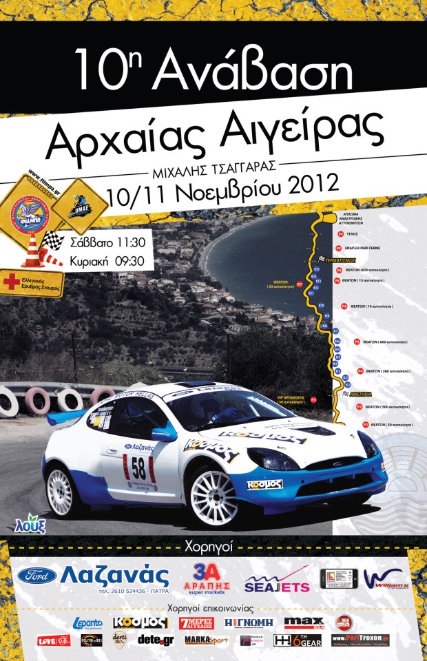 Η ΦΙΛ.Μ.Π.Α. ( Φίλοι Μηχανοκίνητου Αθλητισμού Πάτρας ) διοργανώνει την << 10η ΑΝΑΒΑΣΗ ΑΡΧΑΙΑΣ ΑΙΓΕΙΡΑΣ - ΜΙΧΑΛΗΣ ΤΣΑΓΓΑΡΑΣ >> Αγώνα Αυτοκινήτων του Πανελληνίου Πρωταθλήματος Αναβάσεων 2012 στις 10-11 Νοεμβρίου 2012.