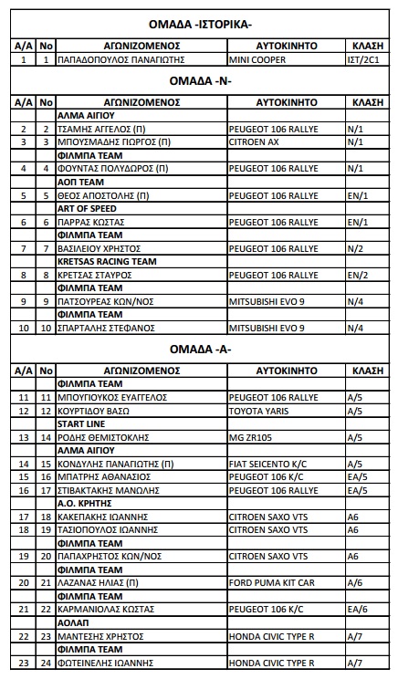 Ευχάριστο νέο ότι συμπλήρωσαν συμμετοχές οι N/1 και Α/5 με νικητές τους Φούντα Πολύβωρο και Στιβακτάκη Μανώλη αντίστοιχα, αμφότεροι με Peugeot 106 Rallye.