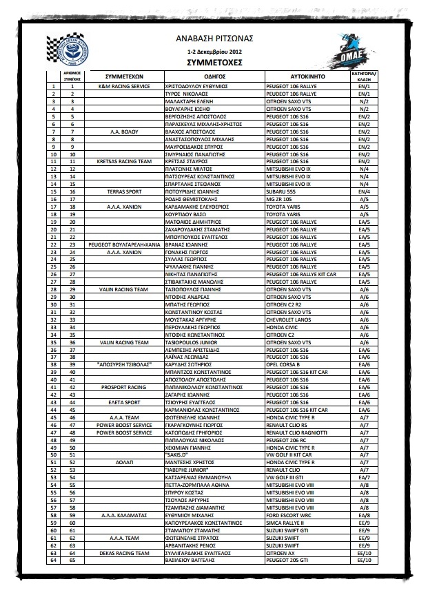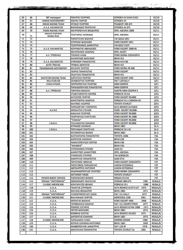 Συμμετοχές Συνολικά είναι 130 .... 114 για τον αγώνα "ταχύτητας" και 16 για τον αγώνα της κατηγορίας Regularity. Συνημμένο: