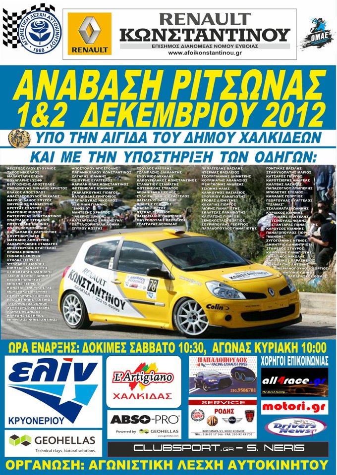 Με έναν από τους πιο δημοφιλείς αγώνες στην Ελλάδα, τη κλασική Ριτσώνα, ολοκληρώνεται το πρώτο Σαββατοκύριακο του Δεκεμβρίου το Πανελλήνιο Πρωτάθλημα Αναβάσεων. Στην γνωστή διαδρομή της Ριτσώνας, μήκους 3,6 χλμ., που κατά καιρούς έχει φιλοξενήσει πάνω από 40.000 θεατές, άνθρωποι και αυτοκίνητα θα αναμετρηθούν με το χρόνο, στην προσπάθειά τους να κατακτήσουν όχι μόνο τη νίκη, αλλά και πρωταθλήματα, κύπελλα και έπαθλα κατηγοριών και κλάσεων, στον μεγάλο τελικό της χρονιάς. Πιθανόν σε κάποιες κατηγορίες οι τίτλοι να έχουν κριθεί, όμως η συμμετοχή και η διάκριση στη δύσκολή και τεχνική, βουνίσια διαδρομή που άνδρωσε γενιές και γενιές οδηγών από το 1956 έως σήμερα, παραμένει όνειρο κάθε αγωνιζόμενου. Άρρηκτα δεμένη με την Ιστορία των Ελληνικών Αγώνων Αυτοκινήτου, η Ριτσώνα παραμένει ένας αγώνας-δυναμόμετρο για ανθρώπους και μηχανές. Κάθε μια από τις 19 στροφές της, κάθε βράχος, κάθε μπαριέρα, κάθε σπιθαμή ασφάλτου, εάν είχαν φωνή θα μπορούσαν να διηγηθούν αμέτρητες ιστορίες αγωνίας και πάθους και να περιγράψουν αλησμόνητες σκηνές θρίλερ. Αυτή ήταν πάντα η Ριτσώνα. Το «μαγικό βουνό» των Ελληνικών αγώνων, η έδρα όλων των αγωνιζόμενων, το γήπεδο των φανατικών θαυμαστών του σπορ στην Ελλάδα. Η φετινή αγωνιστική εκδήλωση, λοιπόν, που διοργανώνει για πολλοστή φορά η Αγωνιστική Λέσχης Αυτοκινήτου και το πολύπειρο επιτελείο της, σε συνεργασία με το Αγωνιστικό ΕΛΠΑ, δεν υπόσχεται θαύματα. Υπόσχεται να κάνει έναν άψογο αγώνα με κάποιες καινοτομίες και εκπλήξεις που θα νοστιμίσουν τη ήδη τέλεια συνταγή. Μια από αυτές είναι τα πανέμορφα Ιστορικά αυτοκίνητα της κατηγορίας «Regularity» που θα αναμετρηθούν με το βουνό σε δικό τους αγώνα ακριβείας, αμέσως μετά την ολοκλήρωση του πρωταθληματικού, δίνοντας την ευκαιρία στους φίλους του μηχανοκίνητου αθλητισμού να απολαύσουν από κοντά και εν δράσει, πανέμορφα τετράτροχα του παρελθόντος, είτε αγωνιστικά, είτε παραγωγής.Μείνετε συντονισμένοι, λοιπόν, έως τη λήξη των συμμετοχών, την Παρασκευή 23 Νοεμβρίου και παράλληλα ετοιμάστε τον εξοπλισμό σας για πικ-νικ στο πευκοδάσος. Η Ριτσώνα, απέχει χρονικά λιγότερο από 20 ημέρες και σε απόσταση λιγότερο από 90 χλμ. από την Αθήνα, μ’ άλλα λόγια είναι πολύ κοντά, για να αγνοηθεί! Σημειώσεις Τίτλος: Ανάβαση Ριτσώνας