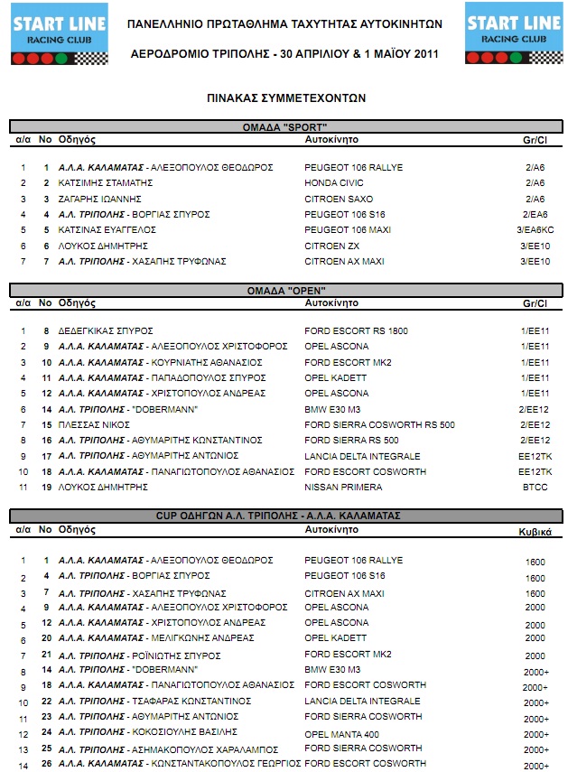 Στις 30 Απριλίου και 1n Μαΐου διοργανώνεται από τη START LINE στο στρατιωτικό αεροδρόμιο της Τρίπολης ο 2ος αγώνας του Πανελληνίου Πρωταθλήματος Ταχύτητας αυτοκινήτων, για τις κατηγορίες SPORT– OPEN καθώς και αγώνας για τα οργανωμένα club για το έπαθλο GTCC 2011. Επίσης θα μετέχουν και οδηγοί για το CUP Α.Λ. ΤΡΙΠΟΛΗΣ - Α.Λ.Α. ΚΑΛΑΜΑΤΑΣ.