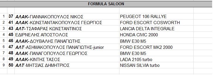 Παράθεση: ΔΕΛΤΙΟ ΤΥΠΟΥ Νο 25ος ΑΓΩΝΑΣ ΠΑΝΕΛΛΗΝΙΟΥ ΠΡΩΤΑΘΛΗΜΑΤΟΣ ΤΑΧΥΤΗΤΑΣ ΑΥΤΟΚΙΝΗΤΩΝΤΡΙΠΟΛΗ 10 & 11 ΔΕΚΕΜΒΡΙΟΥ 2011 Με 56 ιδιαίτερα ενδιαφέρουσες συμμετοχές θα κλείσει για το 2011 το Πανελλήνιο Πρωτάθλημα Ταχύτητας αυτοκινήτων, με τον 5 και τελευταίο αγώνα που θα γίνει στο στρατιωτικό αεροδρόμιο της Τρίπολης το Σάββατο 10 και την Κυριακή 11 Δεκεμβρίου. Ο αγώνας διοργανώνεται από τη START LINE και γίνεται με την υποστήριξη το Δήμου Τριπόλεως με μεγάλο χορηγό τον Όμιλο «ΤΖΑΒΑΡΑΣ Α.Ε.». Εκτός από τις κατηγορίες SPORT – OPEN – ΙΣΤΟΡΙΚΑ, συμμετοχές για το CUP Α.Λ. ΤΡΙΠΟΛΗΣ – Α.Λ.Α. ΚΑΛΑΜΑΤΑΣ και 65 συμμετοχές για τα οργανωμένα clubs για το έπαθλο GTCC, για πρώτη φορά σε αγώνα ταχύτητας θα κάνει την εμφάνισή της η κατηγορία «FORMULA SALOON» με πολύ δυνατά και εντυπωσιακά αυτοκίνητα σε δικό τους αγώνα. Ο Διοικητικός και Τεχνικός έλεγχος θα γίνει το Σάββατο 10/12 από τις 08:30 – 10:00, ενώ τα ελεύθερα δοκιμαστικά θα αρχίσουν την ίδια μέρα στις 10:30. Ο αγώνας της Κυριακής 11/12 θα ξεκινήσει με το warm up στις 09:15, ενώ ο πρώτος αγώνας θα αρχίσει στις 10:30. Όσοι θέλουν περισσότερες πληροφορίες, μπορούν να επικοινωνούν στο τηλέφωνο 6973 030 125 ή στα τηλέφωνα & φαξ της Λέσχης 210 9812341 & 210 9821069. Από το ΓΡΑΦΕΙΟ ΤΥΠΟΥ Οι 56 Συμμετοχές Συνημμένο: