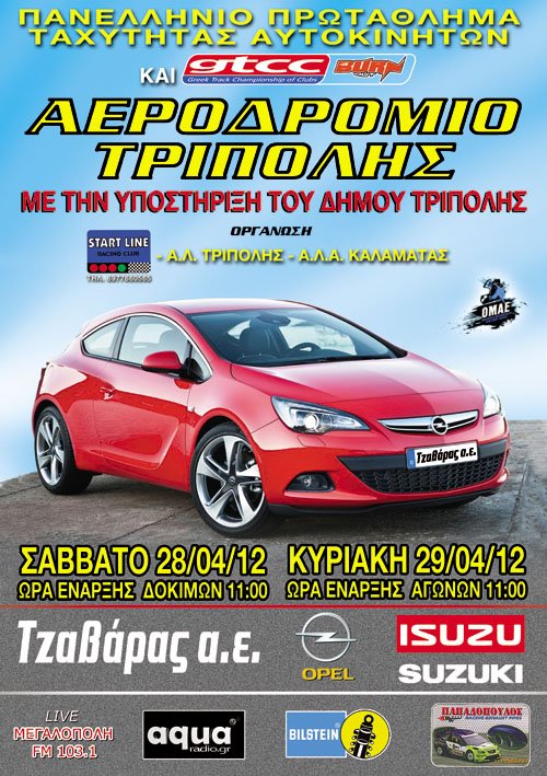 Ο 1ος αγώνας για το Πανελλήνιο Πρωτάθλημα Αυτοκινήτων διοργανώνεται υπό την αιγίδα του Δήμου Τρίπολης, το Σάββατο 28 και την Κυριακή 29 Απριλίου στο στρατιωτικό αεροδρόμιο της Τρίπολης