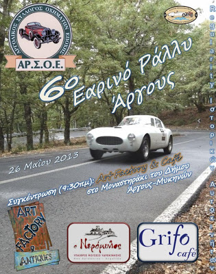 Παράθεση: Ο ΑΡΣΟΕ, όπως προανήγγειλε, διοργανώνει στις 26 Μαΐου το “6ο Εαρινό Ράλλυ Άργους”. Η εκκίνηση του αγώνα θα πραγματοποιηθεί στο “Art Factory” στο Μοναστηράκι του Δήμου Άργους-Μυκηνών στην Νέα Εθνική Μυκηνών-Ναυπλίου, με το πρώτο αυτοκίνητο… να εκκινεί στις 10:00 πμ. Προτείνουμε τα πληρώματα να συγκεντρωθούν τουλάχιστον μισή ώρα πριν στο χώρο εκκίνησης, ώστε να θαυμάσουν τα πολύ όμορφα χειροποίητα και μη αποκτήματα της έκθεσης.