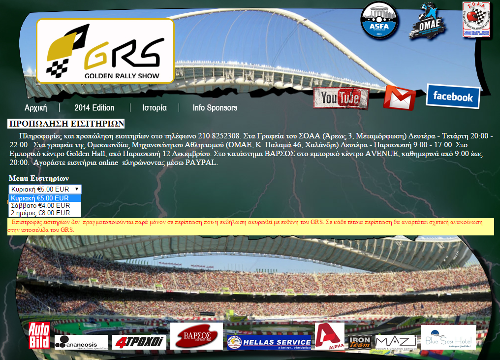 Η διοργάνωση από φέτος ονομάζεται πλέον “Golden Rally Show” (GRS) και φιλοδοξεί να γίνει θεσμός στο χώρο του μηχανοκίνητου αθλητισμού. Η διεξαγωγή της έχει προγραμματιστεί για τις 20-21 Δεκεμβρίου 2014 στην καρδιά της Αθήνας, το Ο.Α.Κ.Α.. Ένα εύκολα προσβάσιμο σημείο για τους θεατές και με μεγάλες δυνατότητες αναφορικά με τη διεξαγωγή του αγώνα, αλλά ταυτόχρονα και με μια “βαριά” αγωνιστική ιστορία, όπως οι υπερειδικές διαδρομές των Ράλι Ακρόπολις των ετών 2005 και 2006. Πέραν της διαφήμισης του αγωνιστικού μέρους, θέλουμε να προβάλλουμε το κοινωνικό πρόσωπο των οδηγών αγώνων, τόσο με κοινωφελείς δράσεις όσο και με μηνύματα κυκλοφοριακής αγωγής και οδικής ασφάλειας. Στόχος μας είναι να αναδείξουμε πως το θέαμα και -κυρίως- η ασφάλεια των οργανωμένων αγώνων είναι σαφώς μεγαλύτερα από τους αυτοσχέδιους αγώνων των ανοικτών δρόμων. Εν κατακλείδι, στόχος μας είναι να διευρύνουμε τον κόσμο των αγώνων αυτοκινήτου.