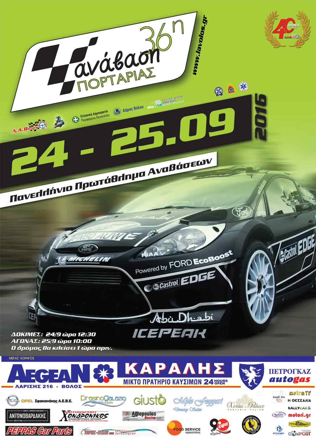 Μεγάλος Χορηγός της Ανάβασης Πορταριάς θα είναι για ακόμη μια χρονιά η Aegean Καραλής, ενώ Χορηγοί είναι η Seajets και το Ξενοδοχείο "Xenia Palace". ΣυμμετοχέςΣυνημμένο: