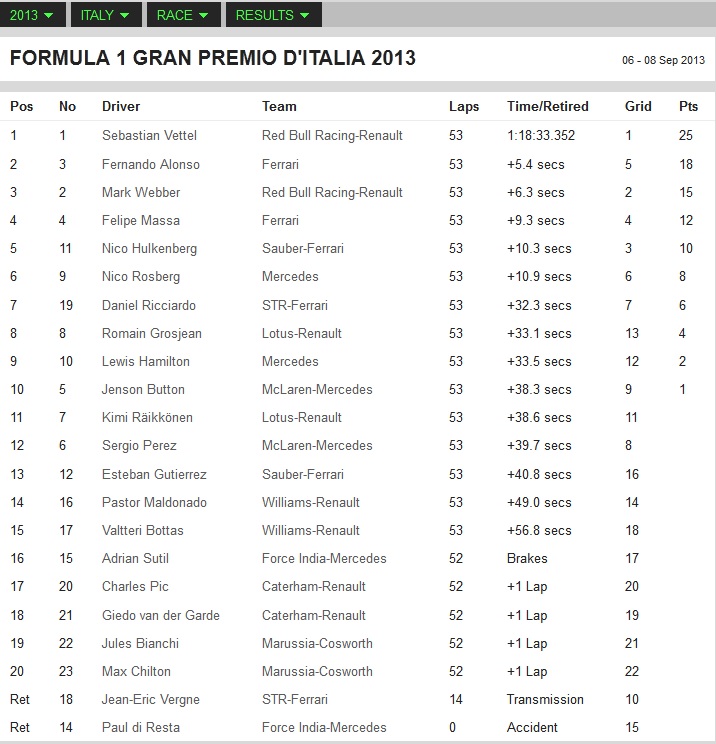 Eκτη φετινή νίκη του Σεμπάστιαν Φέτελ σε 12 αγώνες,δεύτερος ο Φερνάντο Αλόνσο που σε κανένα σημείο του αγώνα δεν κατάφερε να πιέση των Φέτελ και έτσι η διαφορά αυξήθηκε στους 53 βαθμούς,τρίτος ο Μάρκ Γουέμπερ. Ο Σεμπάστιαν Φέτελ έφτασε τις 32 νίκες στην F1 και ισοφάρισε των Φερνάντο Αλόνσο. Της περισσότερες νίκες στην F1 έχει ο Μίχαελ Σουμάχερ με 91 νίκες,δεύτερος ειναι ο Άλεν Προστ με 51 νίκες και τρίτος ο Άιρτον Σένα με 41 νίκες.