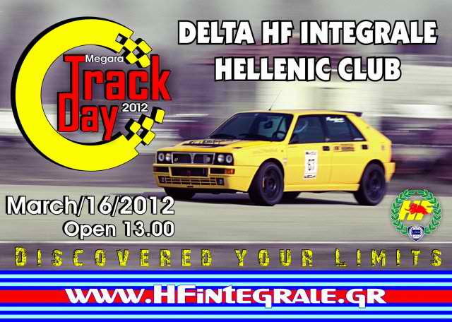 Το 3ο Open Trackday από το Delta HF Integrale Hellenic Club είναι γεγονός και την Παρασκευή 16/3/2012, ημερομηνία πραγματοποίησής του, όλοι οι φίλοι του Συλλόγου είναι προσκεκλημένοι. Τοποθεσία διεξαγωγής το αυτοκινητοδρόμιο Μεγάρων και το event θα είναι ανοιχτό σε όλους ανεξάρτητα από τον τύπο η την μάρκα του αυτοκινήτου!!! Σκοπός μας είναι να μαζευτούμε όσο το δυνατόν περισσότεροι για να περάσουμε όμορφα και να δούμε πόσο καλά μπορούμε να τα πάμε στον τομέα της διοργάνωσης!!! Η συμμετοχή ορίστηκε στα 40€!. Γιαυτο λοιπόν πείτε σε όσους γνωστούς και φίλους έχετε για να έχουμε έναν δυνατό αριθμό συμμετοχών! Το trackday θα ξεκινήσει στις 13:00 μέχρι τη δύση του ηλίου και θα είναι ανοιχτό χωρίς χρονομετρημένα με max 8 αυτοκίνητα εντός πίστας. http://www.hfintegrale.gr