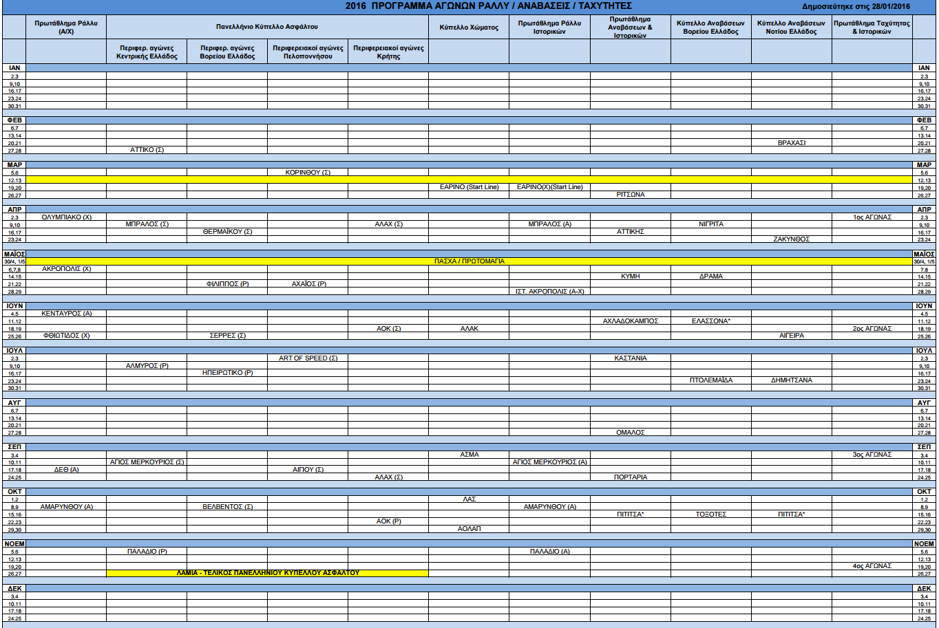 Βάσει του ανακοινωθέντος για το έτος 2016 προγράμματος, στο πρωτάθλημα αναβάσεων θα διεξαχθούν πέντε διαφορετικοί αγώνες για τις κατηγορίες Ν, Α, Ε, Ιστορικά και Saloon.