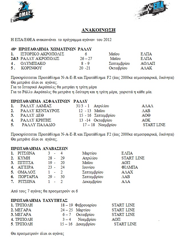 Ανακοινώνεται το πρόγραμμα των αγωνιστικών δραστηριοτήτων για τις εγχώριες διοργανώσεις μηχανοκίνητου αθλητισμού, όπως αυτό καταρτίστηκε από την ΕΠ.Α./ΕΘ.Ε.Α..