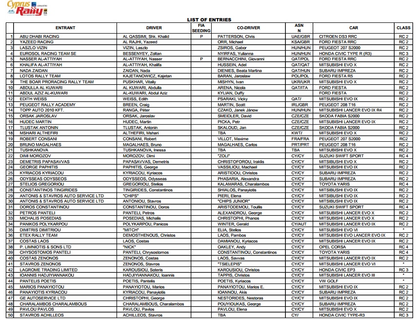 Αποτελέσματα της qualifing stage: http://timing.sporttraxx.com/races/cypr ... #results/1Ταχύτατος όλων ο Kajto. Και σε φωτό η σειρά εκκίνησης από τη σελίδα fb του rally