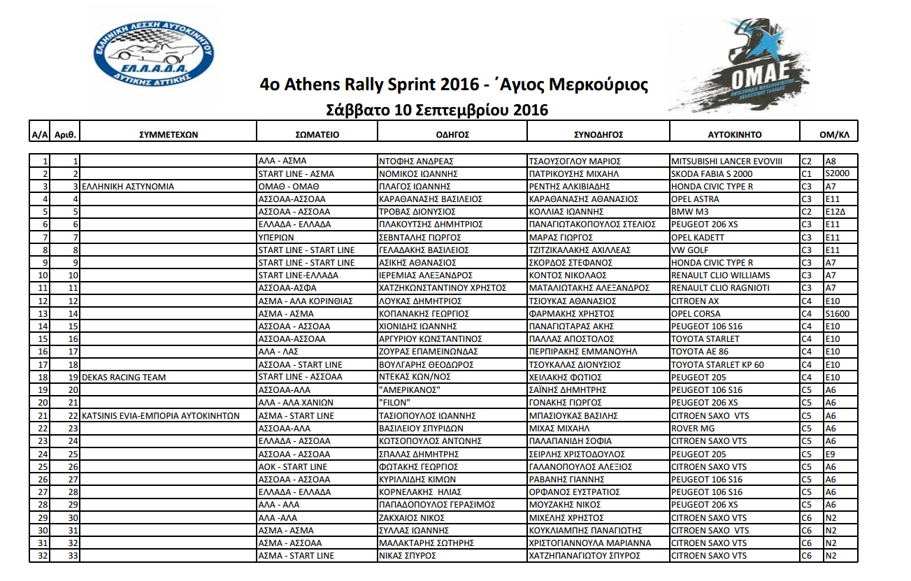 4ο Athens Rally Sprint: Συμμετοχές