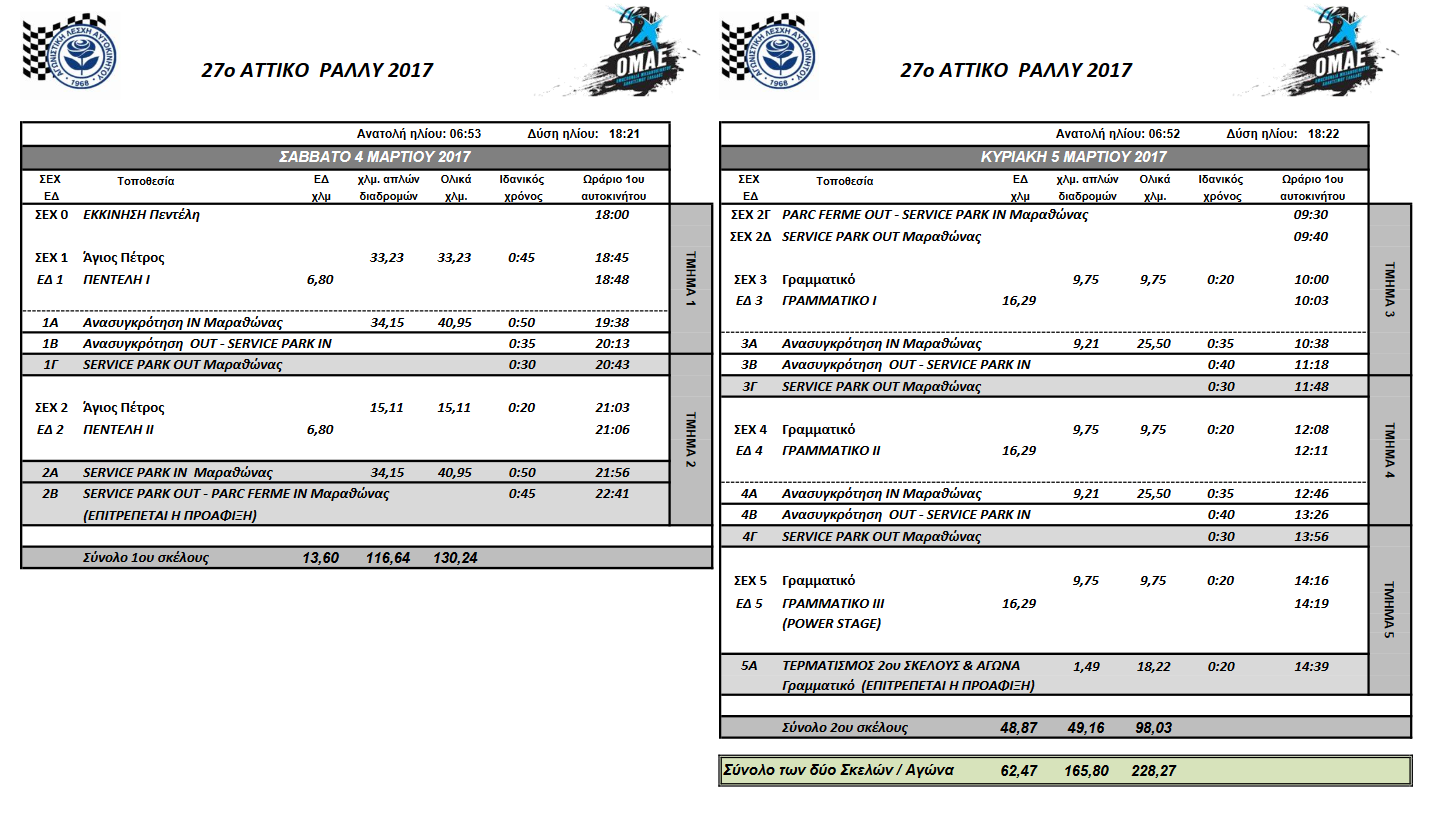 Από την Οργανωτική Επιτροπή του Αγώνα Παράθεση: ΔΕΛΤΙΟ ΤΥΠΟΥ Νο. 2 Η Αγωνιστική Λέσχη Αυτοκινήτου, (Α.Λ.Α.), σας ανακοινώνει περισσότερα στοιχεία για το «27ο Αττικό Ράλλυ 2017» που θα γίνει το Σαββατο-Κύριακο 4 και 5 Μαρτίου 2017. Ο αγώνας περιλαμβάνεται στο Πανελλήνιο Κύπελλο Ασφάλτου / Περιφερειακό Κύπελλο Νοτίου Ελλάδος και στο Πρωτάθλημα Ράλλυ Ιστορικών Αυτοκινήτων. Το συνοπτικό πρόγραμμα του αγώνα έχει ως εξής: Α. Το Σάββατο 4 Μαρτίου 2017: Η εκκίνηση του αγώνα θα δοθεί στην Πλατεία Αγίας Τριάδος (Π. Πεντέλη). Το πρώτο αγωνιστικό αυτοκίνητο θα ξεκινήσει στις 18:45 και θα τερματίσει στις 22:16. Η «Ειδική Διαδρομή ΠΕΝΤΕΛΗ» μήκους 7,2 χλμ θα είναι νυχτερινή και θα γίνει δύο φορές στη γνωστή ασφάλτινη περιφερειακή οδό με κατεύθυνση από Άγιο Πέτρο προς Πεντέλη. Επισημαίνεται ότι η «Ειδική Διαδρομή Πεντέλη» θα είναι κλειστή για τα αυτοκίνητα θεατών από τις 17:30 και μέχρι τη διέλευση και του τελευταίου αγωνιζομένου, δηλ. περίπου μέχρι τις 23:30. Β. Την Κυριακή 5 Μαρτίου 2017: Το πρώτο αυτοκίνητο θα εκκινήσει από την Πλατεία Αγίας Τριάδος (Π. Πεντέλη) στις 8:20 το πρωί και θα κατευθυνθεί προς Γραμματικό για την πρώτη ειδική διαδρομής της ημέρας. Η «Ειδική Διαδρομή ΓΡΑΜΜΑΤΙΚΟ» μήκους 15,9 χλμ περίπου θα είναι η επίσης γνωστή ασφάλτινη οδός λίγο μετά το Γραμματικό προς Σέσι. Θα γίνει τρείς φορές με κατεύθυνση από Γραμματικό, διασταύρωση προς Σέσι, και μέσω της οδού Πρ. Ηλία στο Γραμματικό (οδός Κοτρωνίου). Η τελευταία «Ειδική Διαδρομή Γραμματικό» είναι με καθεστώς PowerStage. Επισημαίνεται ότι η Ειδική Διαδρομή «Γραμματικό» θα είναι κλειστή για όλα τα αυτοκίνητα από ώρα 8:30 το πρωί και μέχρι τη διέλευση και του τελευταίου αγωνιστικού αυτοκινήτου, δηλ. περίπου μέχρι ώρα 16:15. Ο τερματισμός του αγώνα και η απονομή των επάθλων στους νικητές θα γίνουν στο Γραμματικό. ServicePark θα λειτουργήσουν το Σάββατο στην Πεντέλη και την Κυριακή στον Μαραθώνα (parking των Ολυμπιακών Εγκαταστάσεων). Με επόμενο Δελτίο Τύπου θα ανακοινωθούν και οι διευκολύνσεις / παροχές για τα εκτός Αττικής πληρώματα που θα λάβουν μέρος στον αγώνα αυτό.   Συνημμένο: