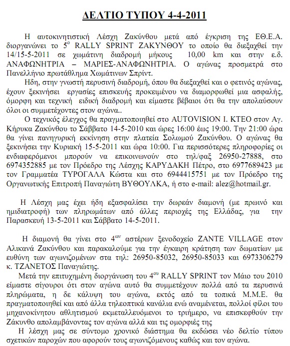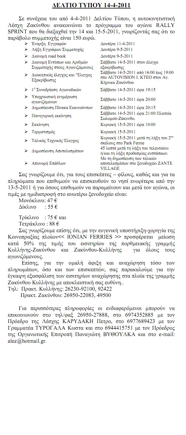 Δημοσίευση Ράλλυ Sprint Ζακύνθου 14-15 / 05 / 2011