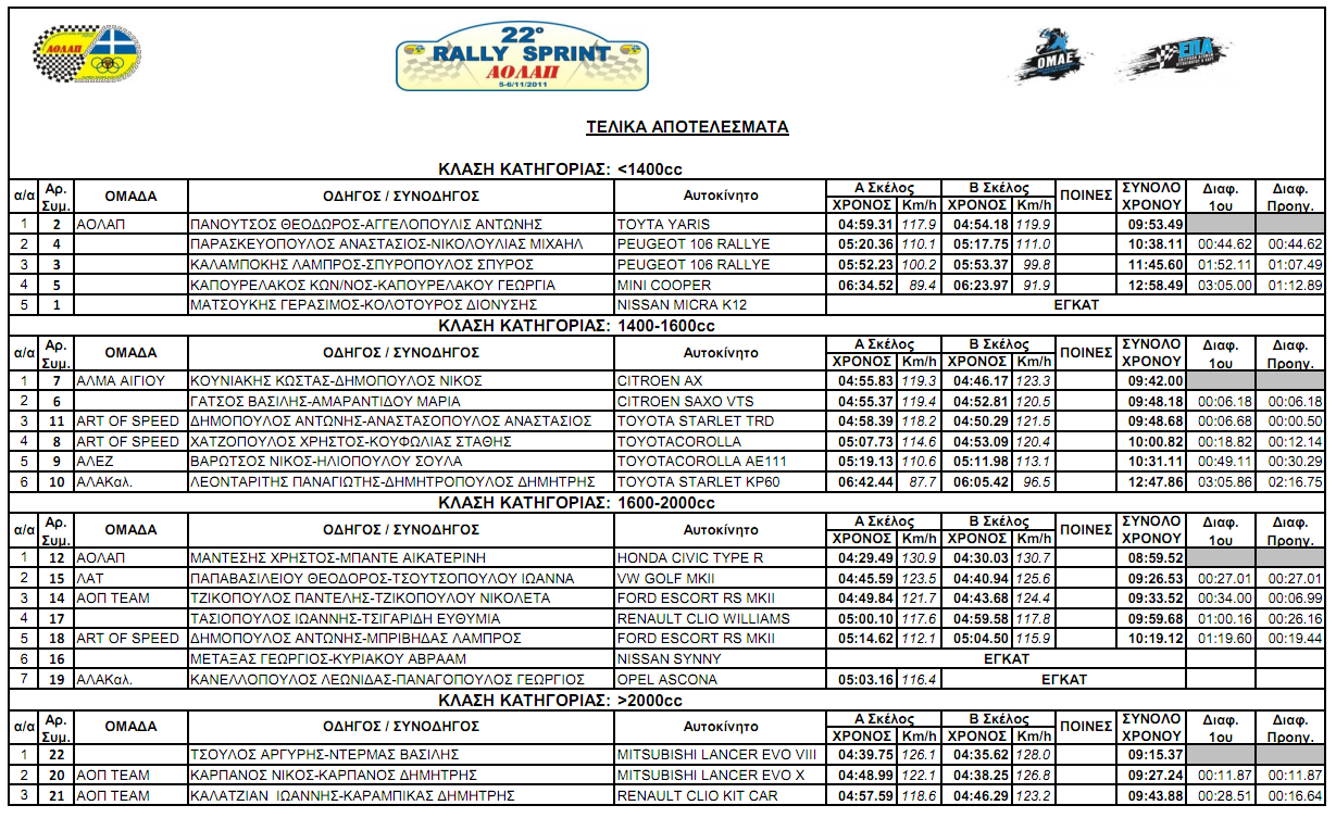22o Ράλλυ Σπριντ Α.Ο.Λ.Α.Π.: Αποτελέσματα