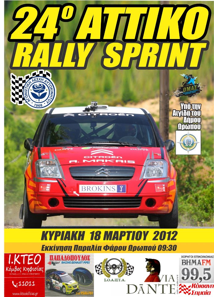 Το 24ο ΑΤΤΙΚΟ ΡΑΛΛΥ ΣΠΡΙΝΤ θα γινει την Κυριακη 18 Μαρτιου 2012 στην απαιτητικη διαδρομη της Μαυροσουβαλας Ωρωπου.