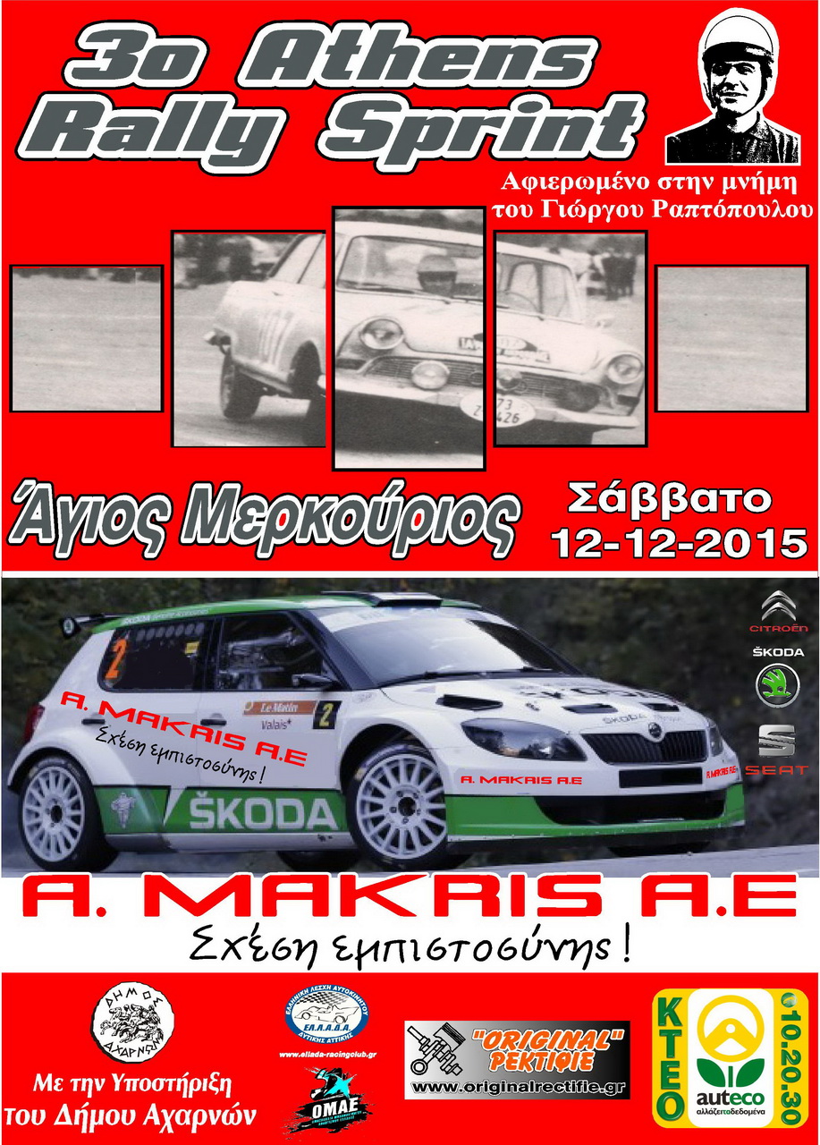Το Αθλητικό Σωματείο "Ελληνική Λέσχη Αυτοκινήτου Δυτικής Αττικής" διοργανώνει το Σάββατο 12 Δεκεμβρίου 2015 το 3ο Athens Rally Sprint, που θα είναι αφιερωμένο στη μνήμη του Γιώργου Ραπτόπουλου.