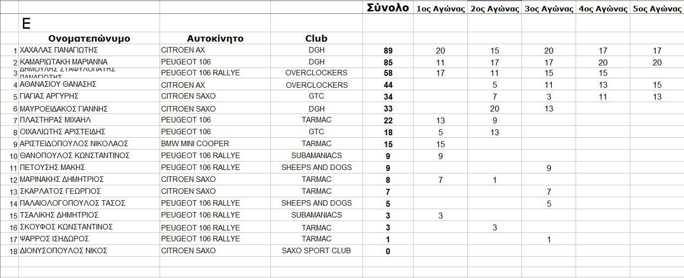 Στην Κατηγορία Ε, με 5 συμμετοχές, νικήτρια ήταν η Μαριάννα Καρωτάκη, με Peugeot 106 1.6, από το Club DGH, με συνολικό χρόνο 3΄16,304 και ταχύτερο γύρο 0΄48,833, στην 2η θέση ήταν ο Παν. Χαχαλάς, με Citroen AX από το Club DGH, με συνολικό χρόνο 3΄17,544 και 3ος ο Θαν. Αθανασίου, με Citroen ΑΧ, από τους Overclokers, με συνολικό χρόνο 3;19,615.