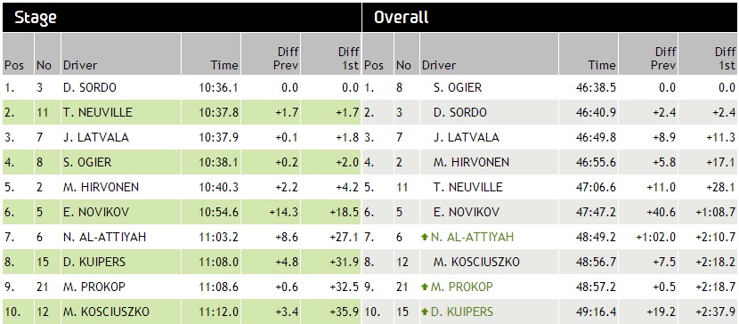 Κατάταξη με το τέλος της πρώτης μέρας 1. 8 S. OGIER 49:33.0 0.0 2. 3 D. SORDO 49:37.4 +4.4 3. 7 J. LATVALA 49:44.4 +11.4 4. 2 M. HIRVONEN 49:49.2 +16.2 5. 11 T. NEUVILLE 50:03.7 +30.7 6. 5 E. NOVIKOV 50:50.0 +1:17.0 7. 6 N. AL-ATTIYAH 51:49.4 +2:16.4 8. 21 M. PROKOP 52:00.9 +2:27.9 9. 12 M. KOSCIUSZKO 52:10.1 +2:37.1 10. 15 D. KUIPERS 52:21.7 +2:48.7 http://www.wrc.com/results/2013/vodafon ... ?stageno=5