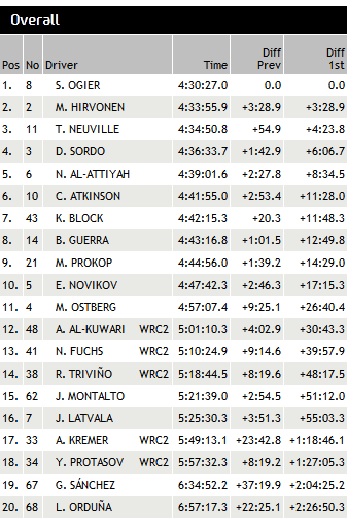 οι αγωνοδίκες έδωσαν πίσω στον Sebastien Ogier το χρόνο που έχασε χθες στην κλειστή πόρτα και έτσι ο Γάλλος απολαμβάνει προβάδισμα 3:32.4 έναντι του Hirvonen