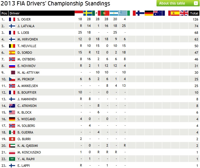 Oι δέκα πρώτη μετά το τέλος της δεύτερης μέρας 1. 7 J. LATVALA 2:32:42.8 0.0 0.0 2. 3 D. SORDO 2:33:46.9 +1:04.1 +1:04.1 3. 11 T. NEUVILLE 2:34:25.9 +39.0 +1:43.1 4. 6 N. AL ATTIYAH 2:36:28.9 +2:03.0 +3:46.1 5. 9 A. MIKKELSEN 2:36:54.6 +25.7 +4:11.8 6. 4 M. OSTBERG 2:38:09.1 +1:14.5 +5:26.3 7. 21 M. PROKOP 2:38:33.1 +24.0 +5:50.3 8. 2 M. HIRVONEN 2:40:35.0 +2:01.9 +7:52.2 9. 5 E. NOVIKOV 2:40:58.9 +23.9 +8:16.1 10. 8 S. OGIER 2:43:12.3 +2:13.4 +10:29.5