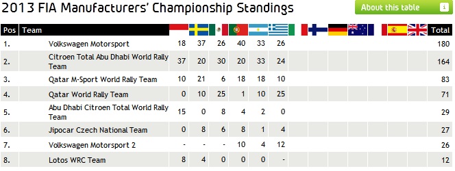 Τελικά αποτελέσματα. 1. 7 J. LATVALA 3:31:01.2 0.0 0.0 2. 3 D. SORDO 3:32:51.2 +1:50.0 +1:50.0 3. 11 T. NEUVILLE 3:33:15.3 +24.1 +2:14.1 4. 9 A. MIKKELSEN 3:34:56.3 +1:41.0 +3:55.1 5. 6 N. AL ATTIYAH 3:35:13.8 +17.5 +4:12.6 6. 4 M. OSTBERG 3:36:49.9 +1:36.1 +5:48.7 7. 2 M. HIRVONEN 3:39:01.9 +2:12.0 +8:00.7 8. 21 M. PROKOP 3:39:02.4 +0.5 +8:01.2 9. 5 E. NOVIKOV 3:39:13.0 +10.6 +8:11.8 10. 8 S. OGIER 3:41:11.5 +1:58.5 +10:10.3