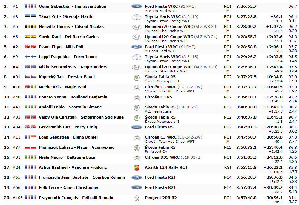 O Meeke ενώ ήταν "Χ" στην προτελευταία ειδική με τον Neuville είχε δυστυχώς έξοδο με αποτελέσμα να τεθεί εκτός μάχης βάθρου και να εκμεταλευτεί την κατάσταση ο tanak o οποίος πλέον προηγείται του neuville με 0,1 δευτρ/τα. Οπότε η μάχη για την δεύτερη θέση αναμένεται καυτη.