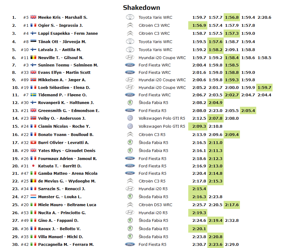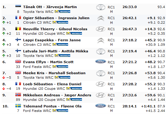 1. 1 FRA S. OGIER 2:08:33.1 2. 11 BEL T. NEUVILLE 2:08:38.4 +5.3 +5.3 3. 10 FIN J. LATVALA 2:10:18.6 +1:40.2 +1:45.5 4. 19 FRA S. LOEB 2:10:23.3 +4.7 +1:50.2 5. 8 EST O. TÄNAK 2:10:58.3 +35.0 +2:25.2 6. 5 GBR K. MEEKE 2:14:03.5 +3:05.2 +5:30.4 7. 21 GBR G. GREENSMITH 2:17:11.3 +3:07.8 +8:38.2 8. 22 FRA Y. BONATO 2:17:30.9 +19.6 +8:57.8 9. 34 FRA S. SARRAZIN 2:18:54.0 +1:23.1 +10:20.9 10. 25 BEL G. DE MEVIUS 2:19:51.6 +57.6 +11:18.5