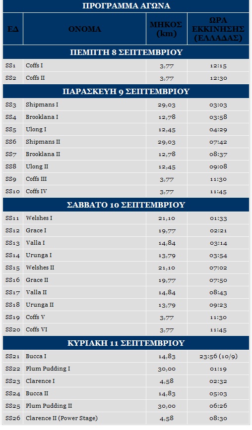 Σε περίπου 1 ώρα το πρώτο αγωνιστικό θα μπεί στην πρώτη απο τις δυο ασφάλτινες Super Ειδικές του Ράλλυ Αυσταραλίας ελέω τών 7ώρών διαφοράς που έχει η Ελλάδα με την χώρα των Καγκουρό.