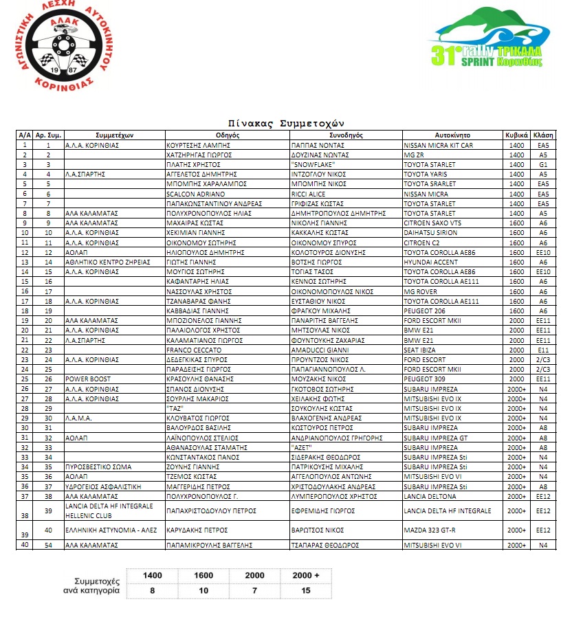 Με 40 συμμετοχές θα γίνει το 31o Rally Sprint – Τρίκαλα Κορινθίας που διοργανώνεται το Σαββατοκύριακο 3 & 4 Σεπτέμβρη από την Α.Λ.Α. Κορινθίας. Ο αγώνας τελείται με την στήριξη του Συλλόγου Επαγγελματιών Τρικάλων Κορινθίας. Σημαντικός ο αριθμός αλλά και η ποιότητα των αγωνιζόμενων που ανταποκρινόμενοι στο κάλεσμα της Λέσχης της Κορίνθιας αλλά και του Συλλόγου Επαγγελματιών Τρικάλων Κορινθίας επέλεξαν να συμμετέχουν στον αγώνα μας παρόλο που το επόμενο Σαββατοκύριακο γίνετε και το Ράλι Σπριντ στα Καμένα Βούρλα (Κύπελλο Χώματος) αλλά και τα δύσκολα οικονομικά όλων μας.